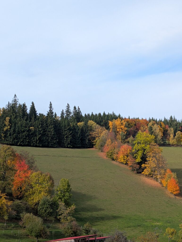 I zbytek cesty je podzimně krásný. Barevný a voňavý. Dalo by se to prodloužit přes Mochov a Hořejší Těšov, to bychom si ale z Kačenky udělali nepřítele. Už takhle tento vyčerpávající pochod místy zvládala jen s vypětím všech sil.